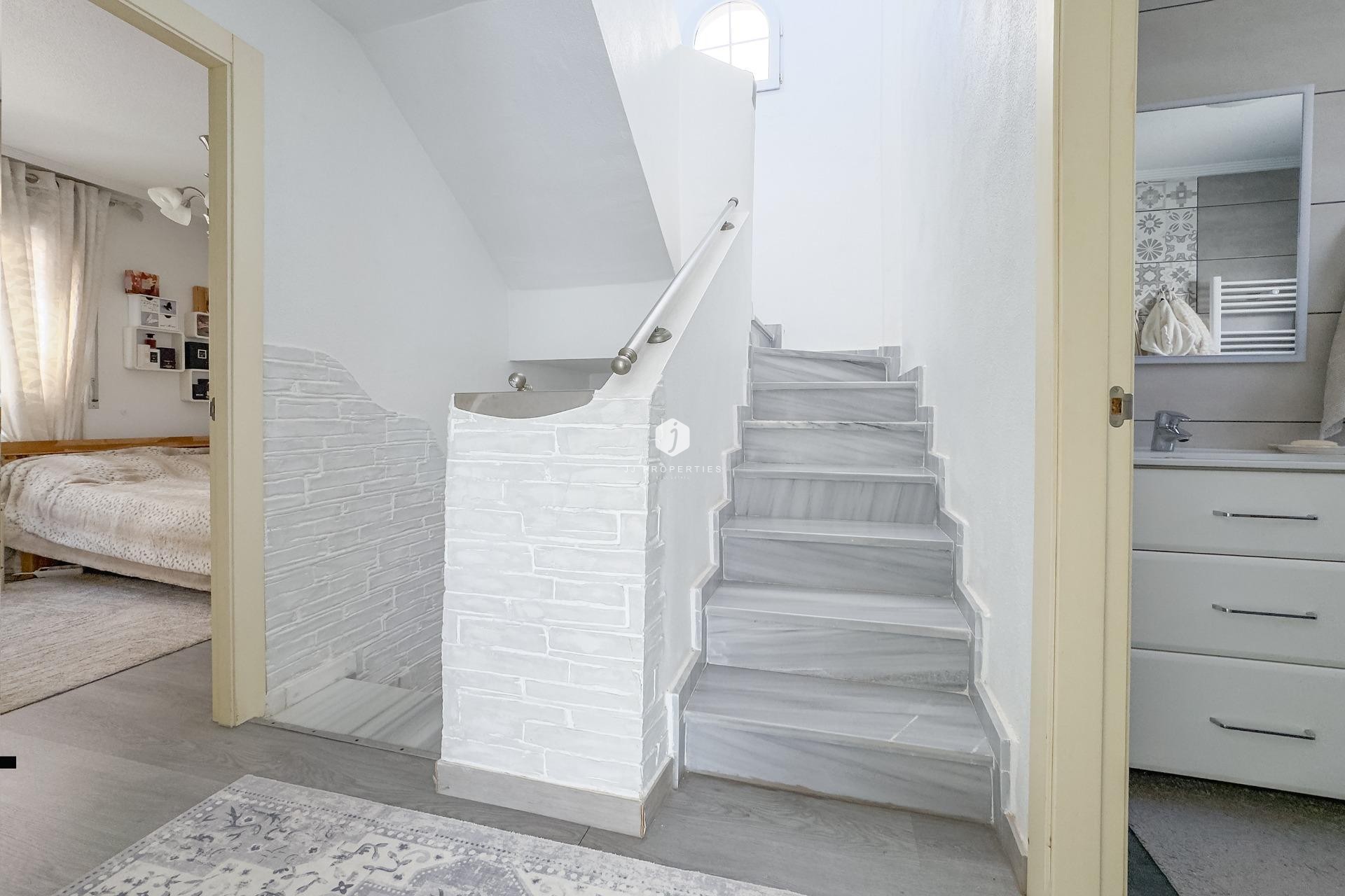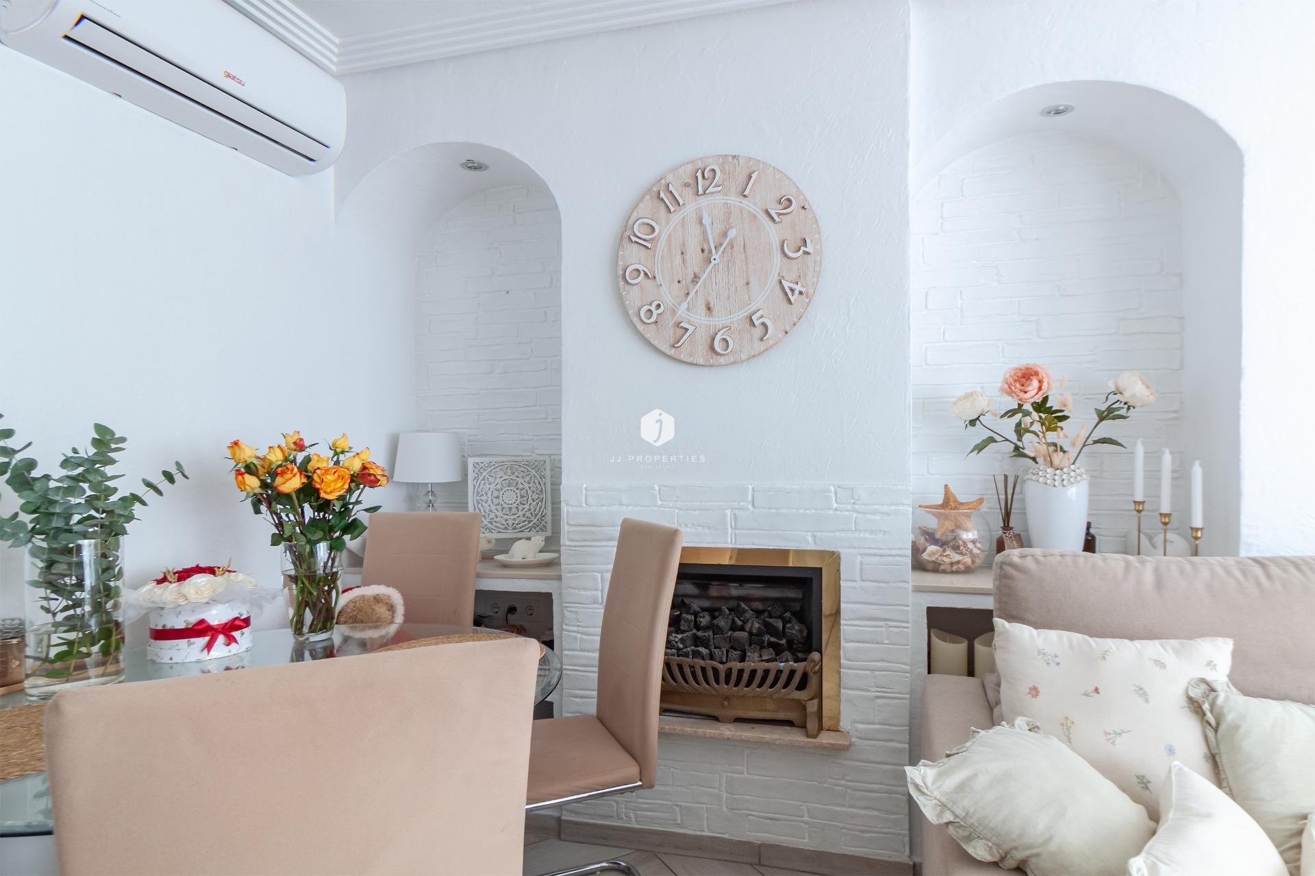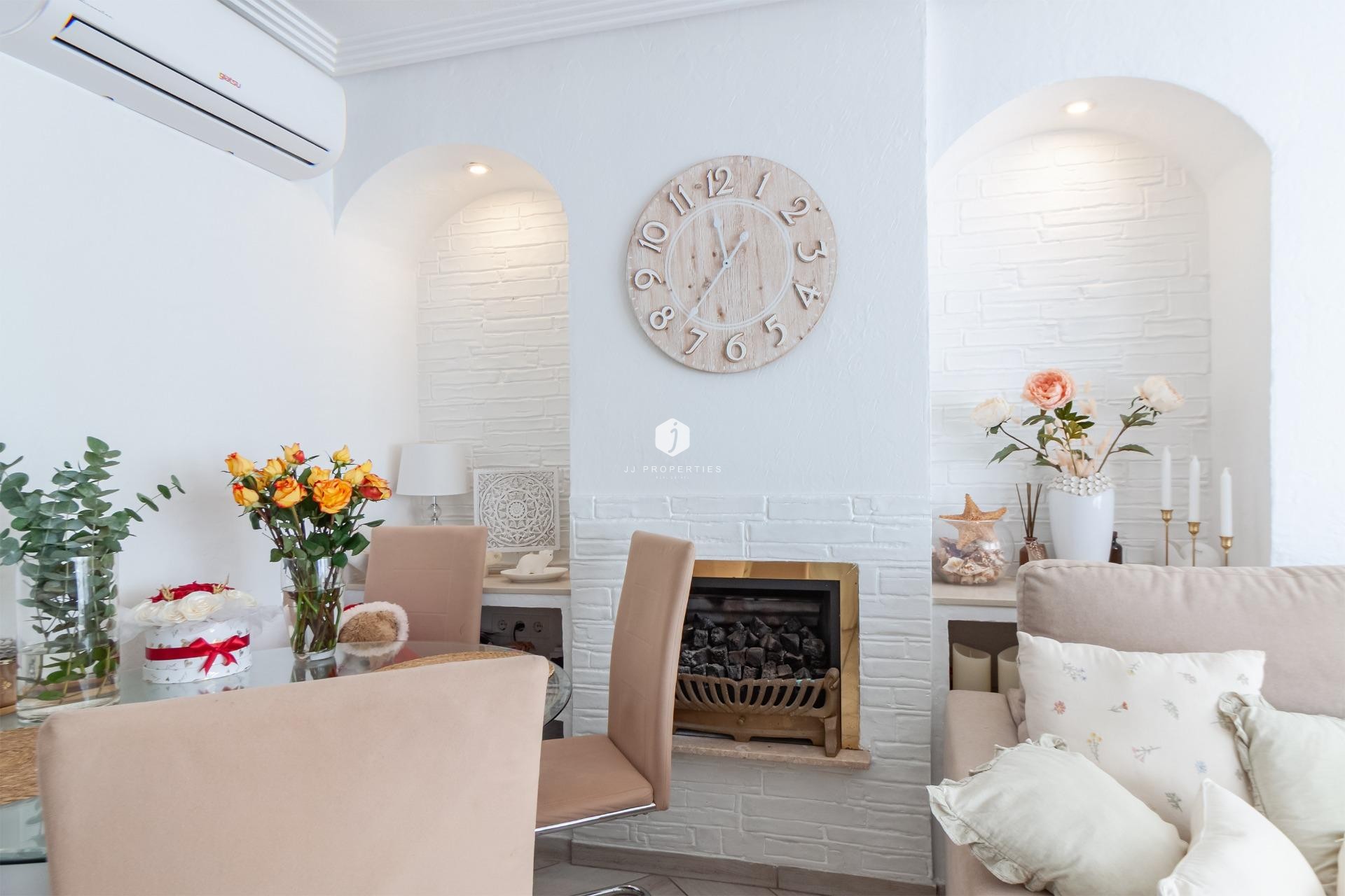 WONDERFUL DETACHED VILLA (approx. 105 m² + TERRACES) WITH GARDEN, TERRACES FACING SOUTHEAST, AND LARGE COMMUNAL POOL! Spacious villa, modernly renovated, and strategically located in Los Almendros between Torrevieja and La Zenia, close to both the AP7 and supermarkets, schools, and other services. In just over 10 minutes by car you reach the centre of Torrevieja, and in just over 5 minutes both the large shopping centre la Zenia Boulevard and the beautiful beaches of Punta Prima. A wonderful house to live in all year round! KEY FEATURES: –Well-maintained gated community with large pool area. –Garden/terrace (approx. 80 m²) with barbecue. –Ground floor: Entrance, large living room with gas fireplace, large independent kitchen (fully equipped), 1 WC, and 1 bedroom (now used as an office). –Floor 1: 1 bathroom (with shower) and 2 large bedrooms, one of which has access to the large balcony facing southeast. –Floor 2: 1 large bedroom, laundry room, and a large terrace, also facing southeast. –Very well maintained – recently renovated and everything still in perfect condition, fully furnished and ready to move into immediately! OTHER ADVANTAGES: –Parking on private street within the community. –Heating (fireplace and radiators) and hot water with natural gas. –Modern AC (air source heat pumps – 5 units) on all three floors. –Close to several supermarkets (Aldi 400 m, Consum 700 m) –Schools within walking distance – 1.5 km to CEIP Colegio Público Playas de Orihuela. –Good public transportation – 700 m to the bus stop (Torrevieja city buses - Line E). –By car about 10 min (6 km) to Torrevieja city centre and about 5 min (3 km) to La Zenia and to the beaches of Punta Prima. –Several golf courses within about 15 min by car. –Community fees: about €29/month. The house was originally built in 2002 but has been recently renovated. The bathrooms are in a modern style, and in the fully equipped kitchen you have both modern appliances, drinking water filter, and of course a modern gas hob, since the house is connected to the natural gas network. Both heating (fireplace and radiators) and hot water are via natural gas, which is normally the cheapest energy source (installation inspected in 2025). However, you also have modern AC (air source heat pumps) throughout the house. And, even though the house is not renovated this year, everything is still in perfect condition, fully furnished and ready to move into immediately! The Los Almendros area is formally located in Orihuela Costa, but is closely intertwined with Los Balcones and Torrevieja. It is a quiet residential area with villas and townhouses, very popular with families with children, and where a lot of new construction has been built in recent years. With only 45 minutes to Alicante airport, it is also attractive for those who do not live there all year round, not least for golf enthusiasts, as there are many nice golf courses nearby. And with just over 10 minutes to both Torrevieja, the third largest city in the Alicante province and with more than 110,000 inhabitants, and to all the popular areas of Orihuela Costa (La Zenia, Playa Flamenca, Cabo Roig etc.), it is of course easy to both commute to work and reach the wonderful beaches along the coast. Don't miss out on this spacious and very well-kept villa. A wonderful house to live in all year round! Contact us today for a viewing!
